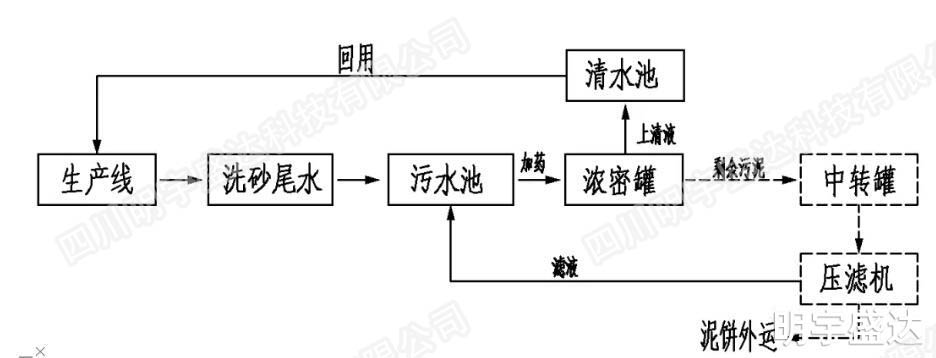 生產(chǎn)加工過(guò)程中需要進(jìn)行洗砂操作以便從原料中分離出成品砂石,期間會(huì)產(chǎn)生洗砂尾水。洗砂尾水的主要污染物指標(biāo)是懸浮物,懸浮物大量存在形成泥渣水,從而導(dǎo)致水體污染,無(wú)法循環(huán)使用。根據(jù)要求,需要對(duì)生產(chǎn)廢水進(jìn)行處理,達(dá)到環(huán)保要求。項(xiàng)目考慮將處理后的廢水進(jìn)行回用。