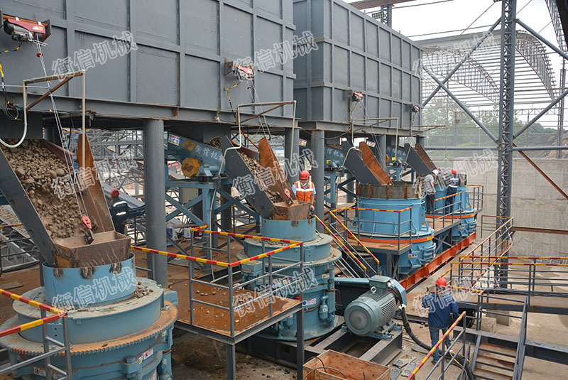 (1)破碎工藝流程:采用顎式破碎機+圓錐破碎機+立軸式沖擊破碎機(制砂機)三級破碎。