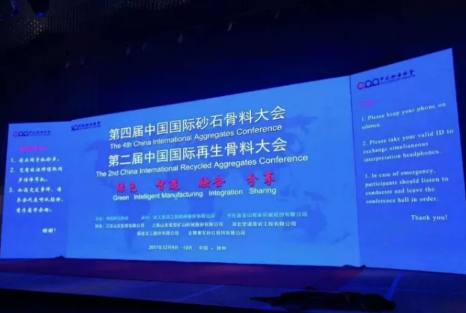2017年12月9日,以“綠色 智造 融合 分享 綠水青山新畫卷 一帶一路新樂章”為主題的第四屆中國國際砂石骨料大會(huì)在徐州召開。共有來自英國、南非、西班牙、新加坡、印度、和“一帶一路”沿線部分國家代表等國際嘉賓、有關(guān)政府部門領(lǐng)導(dǎo),國內(nèi)外專家、學(xué)者和砂石骨料行業(yè)企業(yè)代表共計(jì)700余人出席了本次大會(huì)。